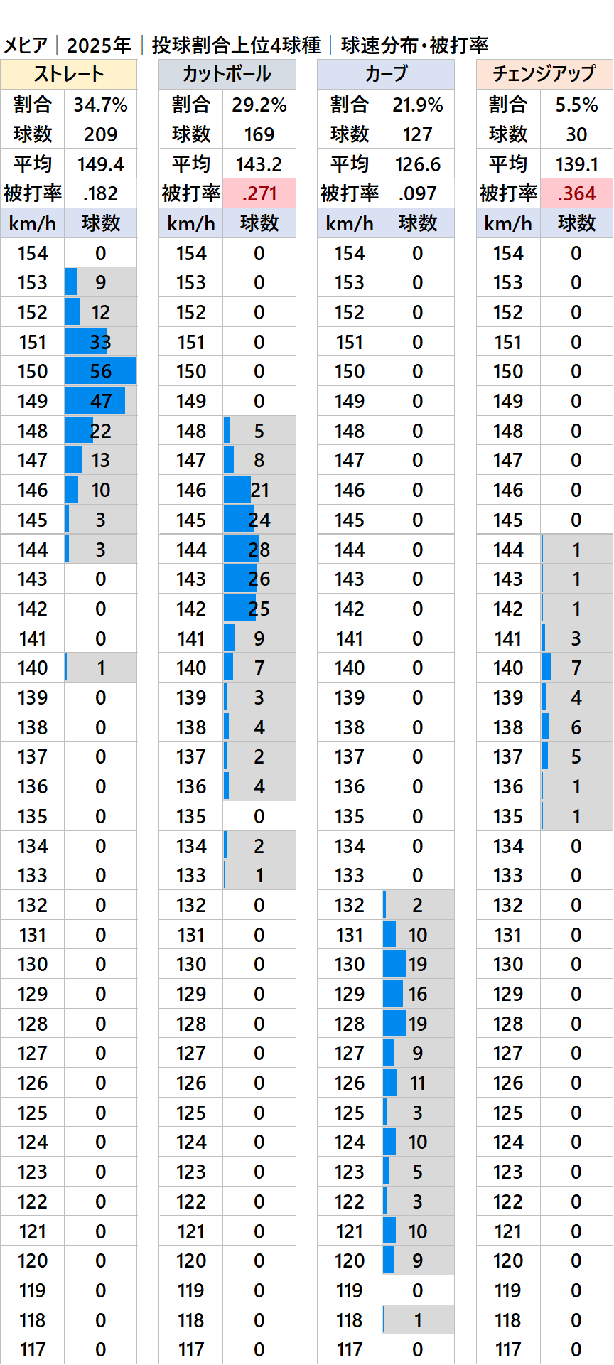 球種別球速・投球割合・被打率