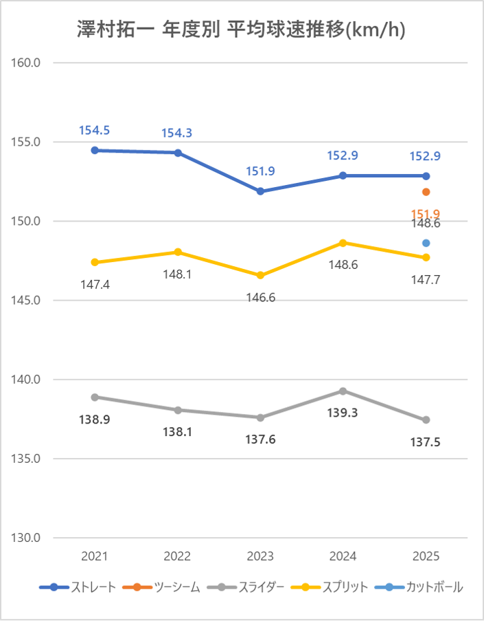 ロッテの澤村拓一投手(右投)の2025年シーズンの球種別の投球割合・球速・被打率の情報です。