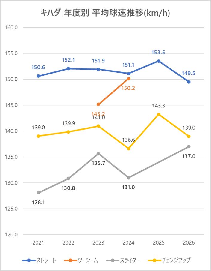2025年と比較しストレートの平均球速は4km/h低下。