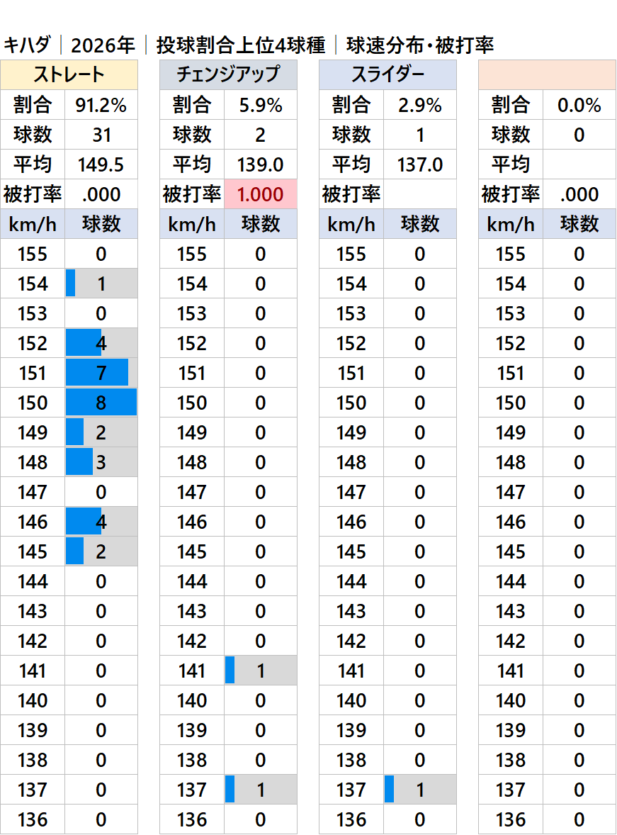 ヤクルトのキハダ投手(左投/ベネズエラ)の2026年シーズンの球種別の投球割合・球速・被打率の情報です。