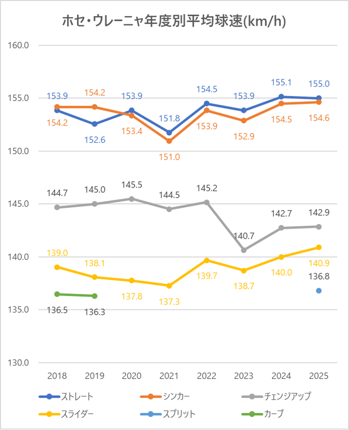 2024年と比較し、シンカー(2シーム)の平均球速は横ばい。