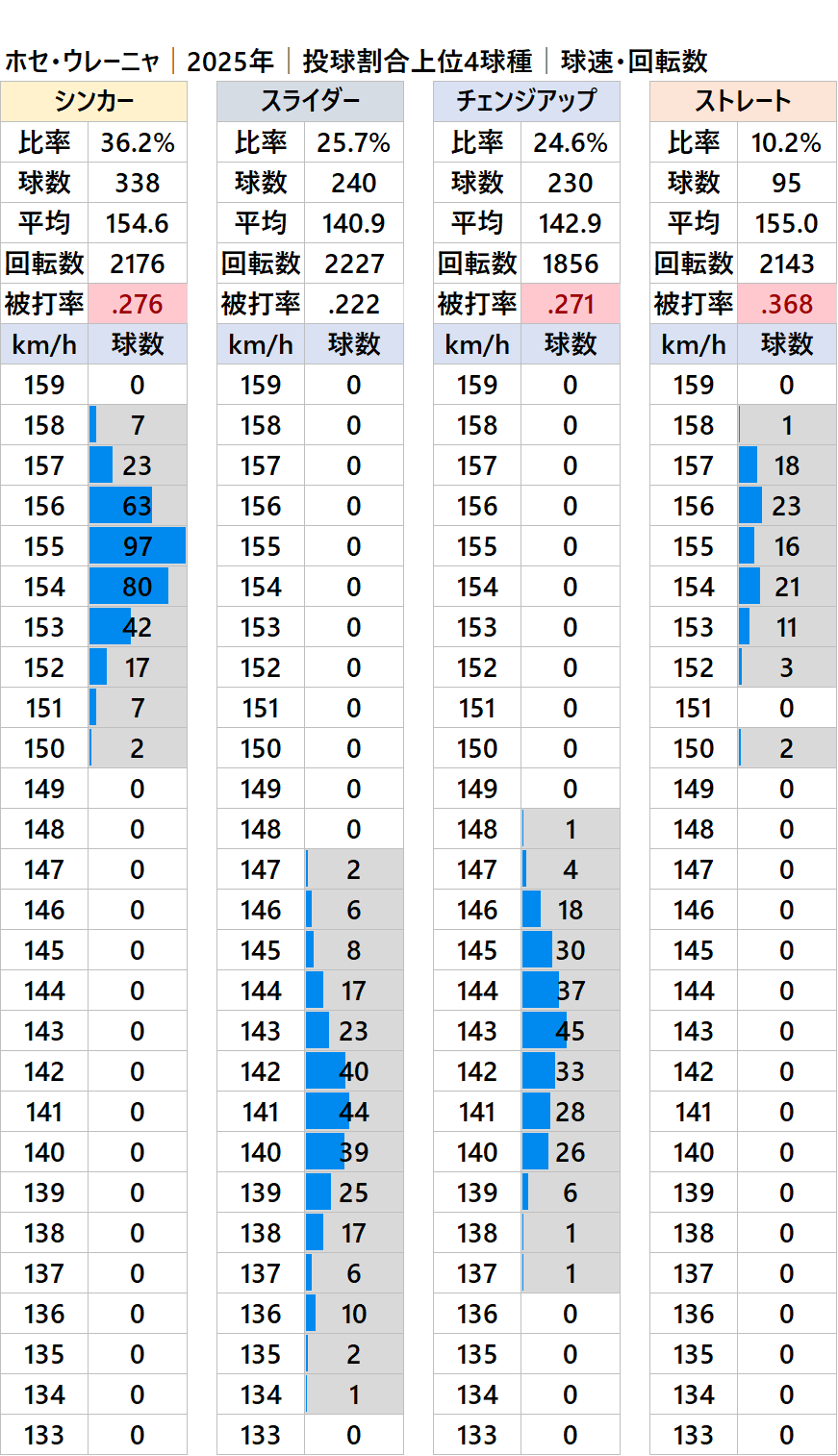 エンゼルスのホセ・ウレーニャ投手(右投/ドミニカ共和国)の2025年シーズンの球速・球種・被打率・回転数の情報です。