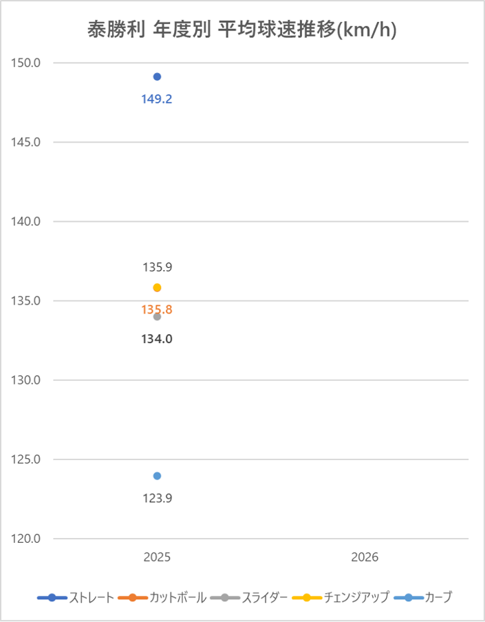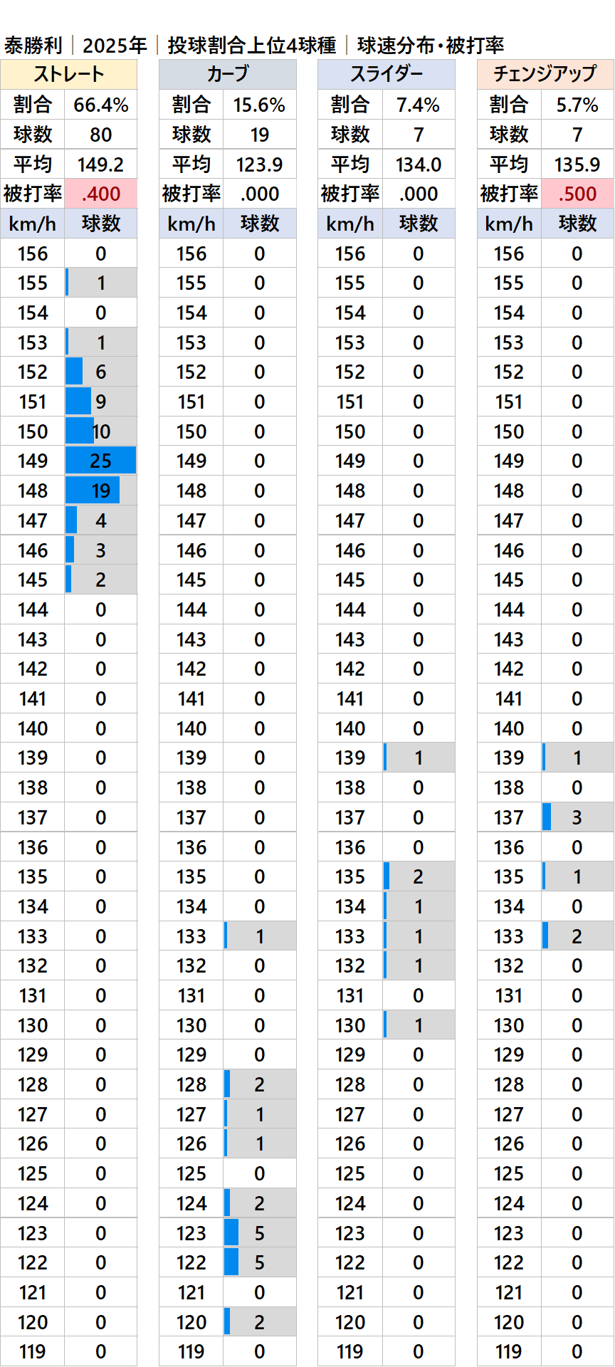 楽天の泰勝利投手(左投)の2025年シーズンの球種別の投球割合・球速・被打率の情報です。