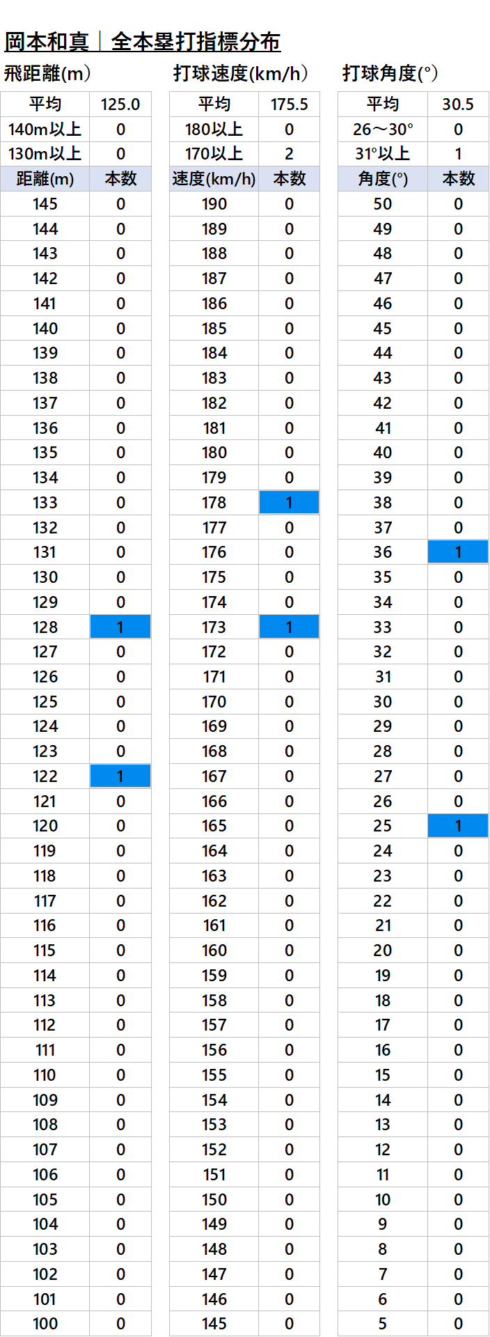 | 年度 | 本数 | 平均 飛距離 | 平均 打球速度 | 平均 角度 |