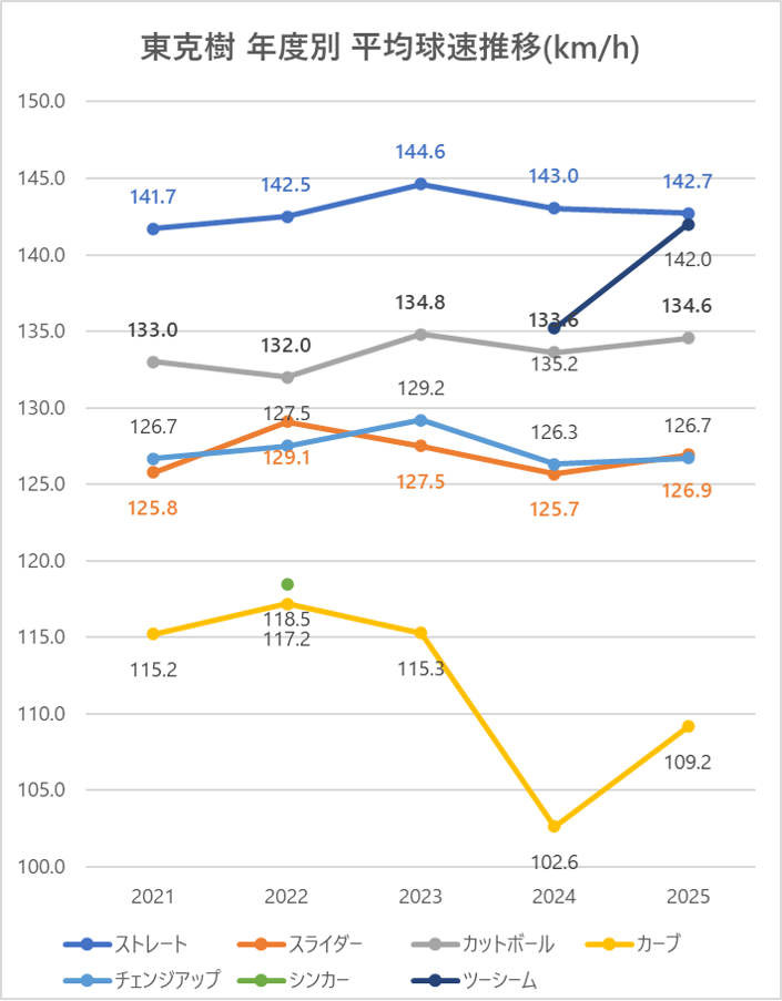 ストレートの平均球速は2024年と比較して0.3km/h低下。
