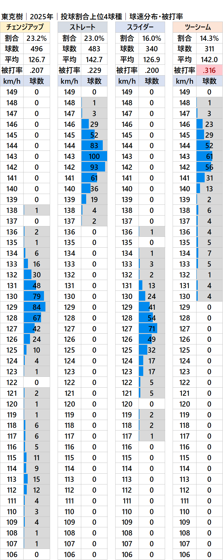 DeNAの左腕、東克樹投手の2025年シーズンの球種別の投球割合・球速・被打率の情報です。