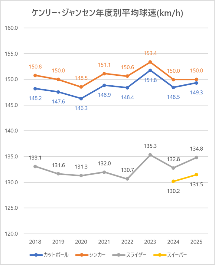 カットボールの平均球速は2024年と比較し0.8km/h上昇。