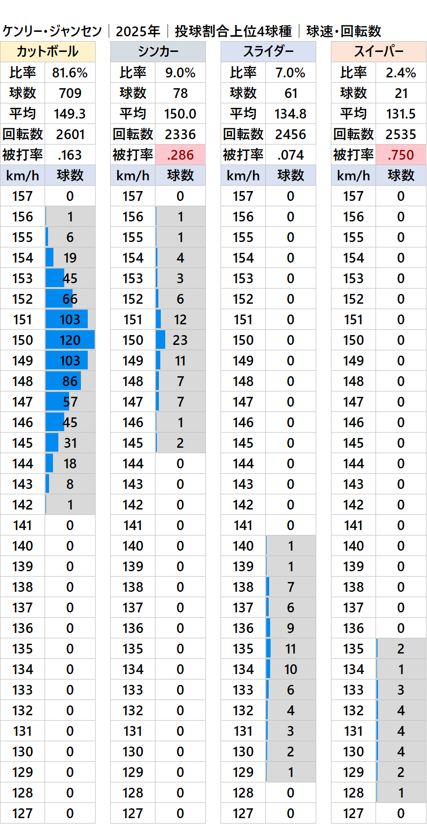 エンゼルスのケンリー・ジャンセン投手の2025年シーズンの球速・球種・被打率・回転数の情報です。