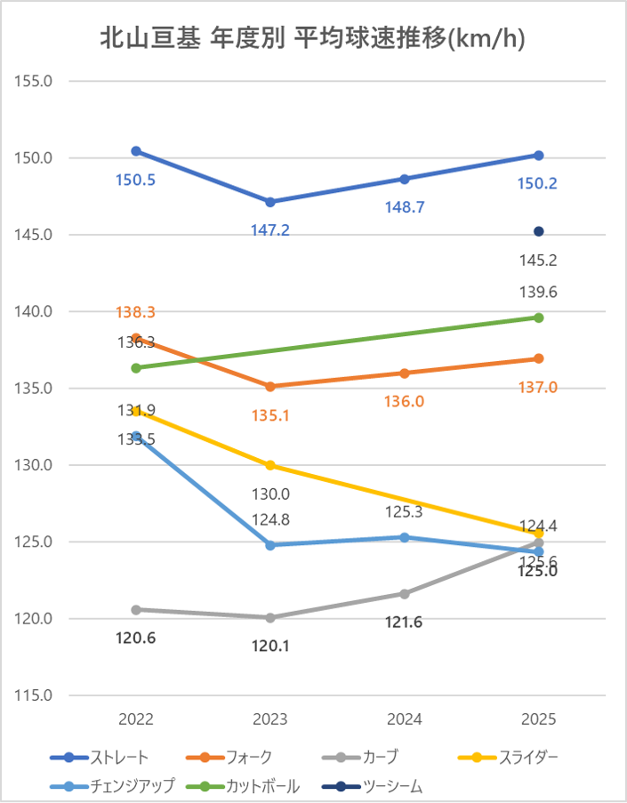 2024年と比較しストレートの平均球速は1.5km/h上昇。