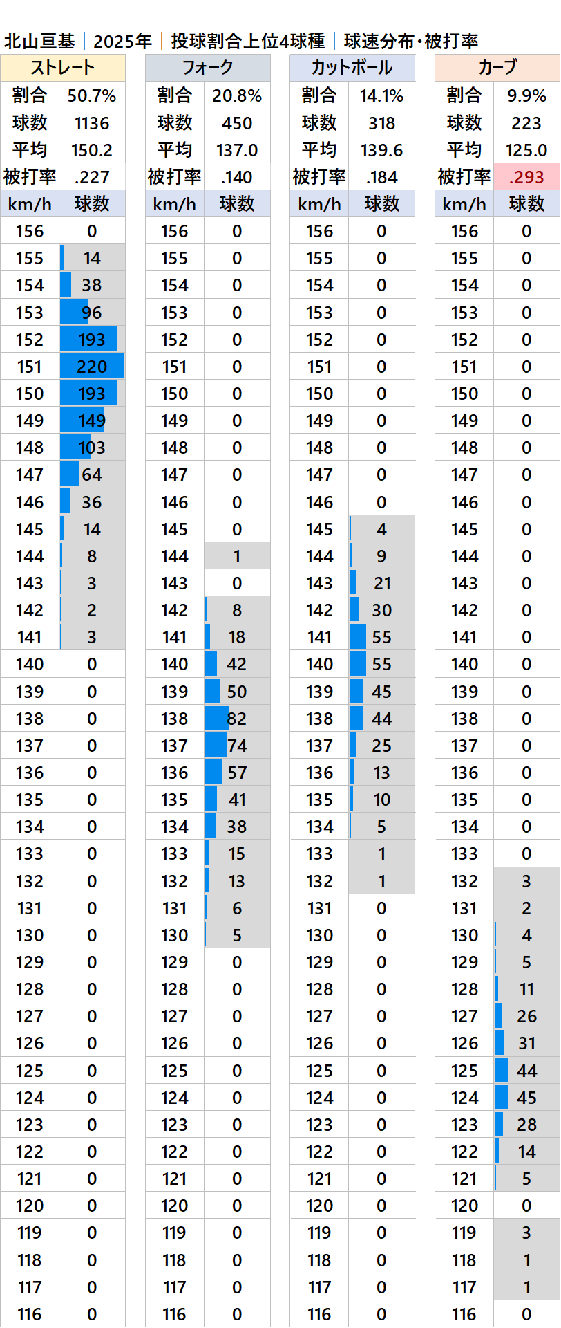日本ハムの北山亘基投手の2025年シーズンの球種別の投球割合・球速・被打率の情報です。