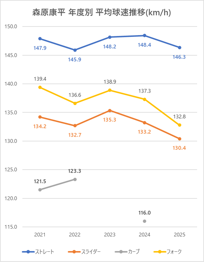 ストレートの平均球速は2024年と比較し約2km/h低下。