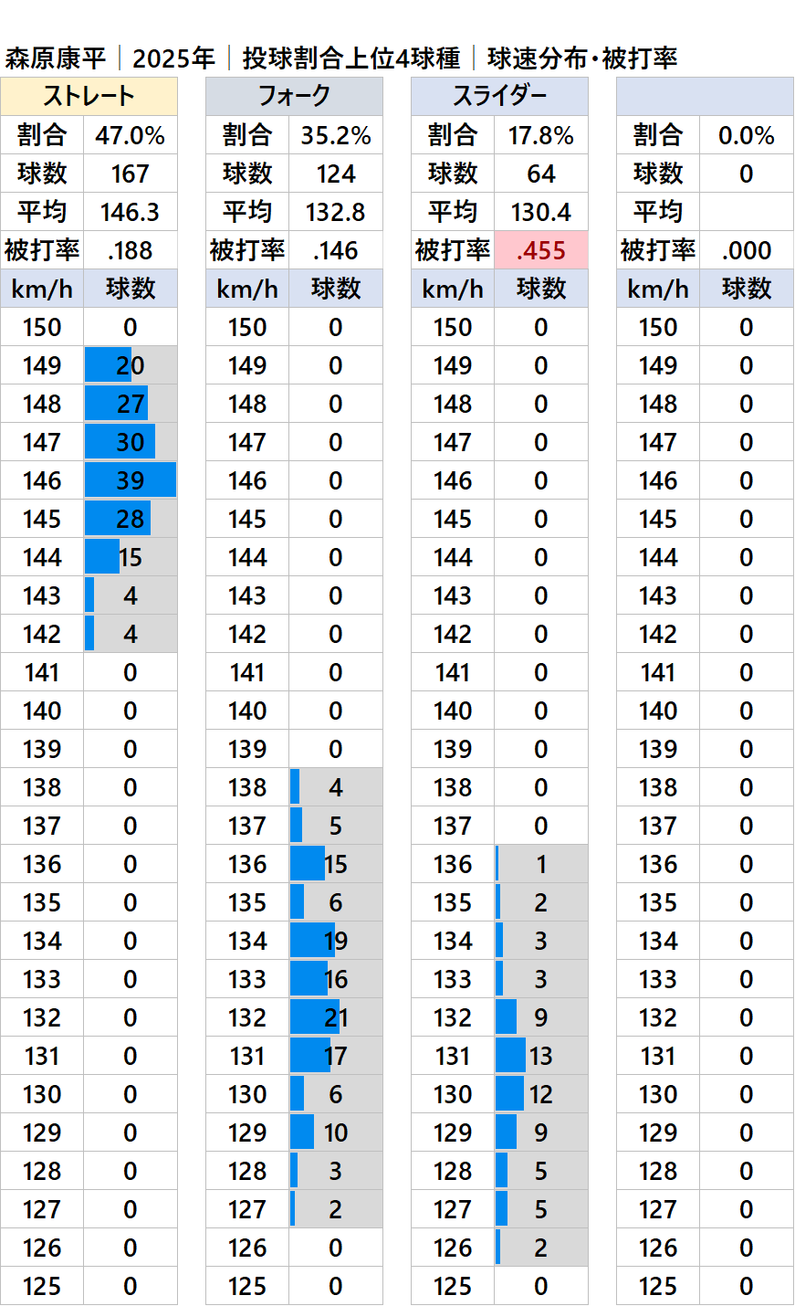 球種別球速・投球割合・被打率