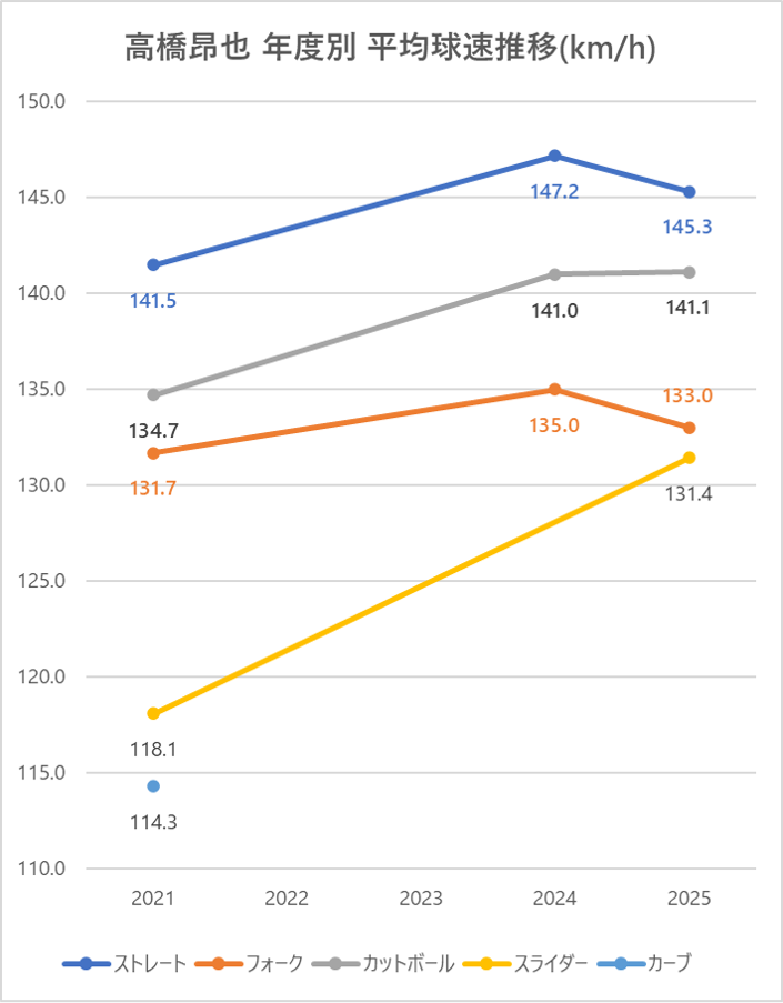 ストレートの平均球速は2024年と比較して1.9km/h低下。