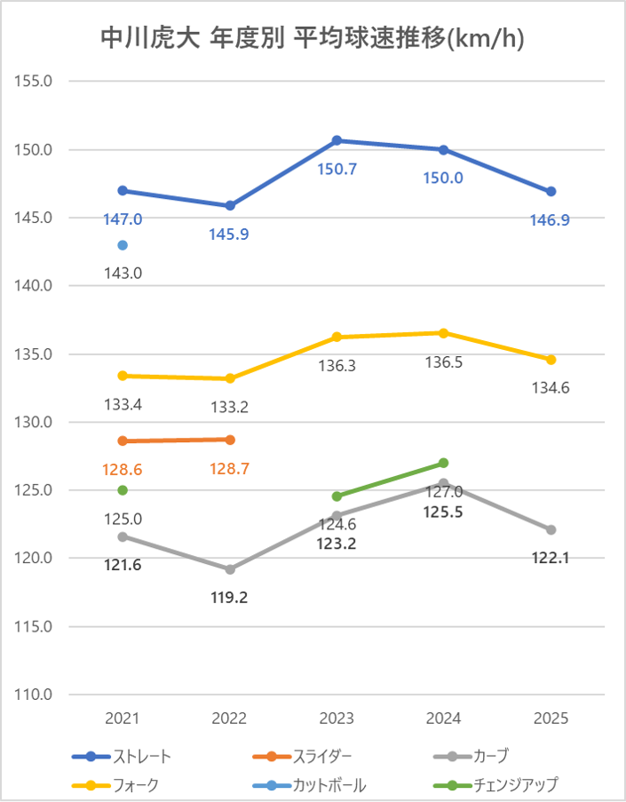 2024年と比較しストレートの平均球速は約3km/h低下。