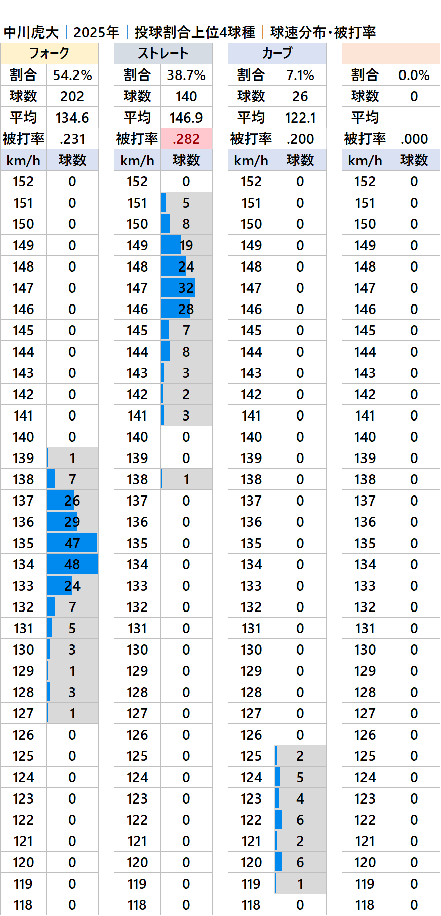 DeNAの中川虎大投手の2024年シーズンの球種別の投球割合・球速・被打率の情報です。