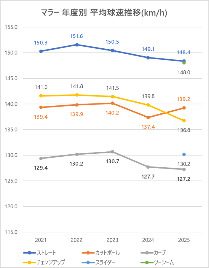 2024年と比較し、ストレートの平均球速は0.7km/h低下。