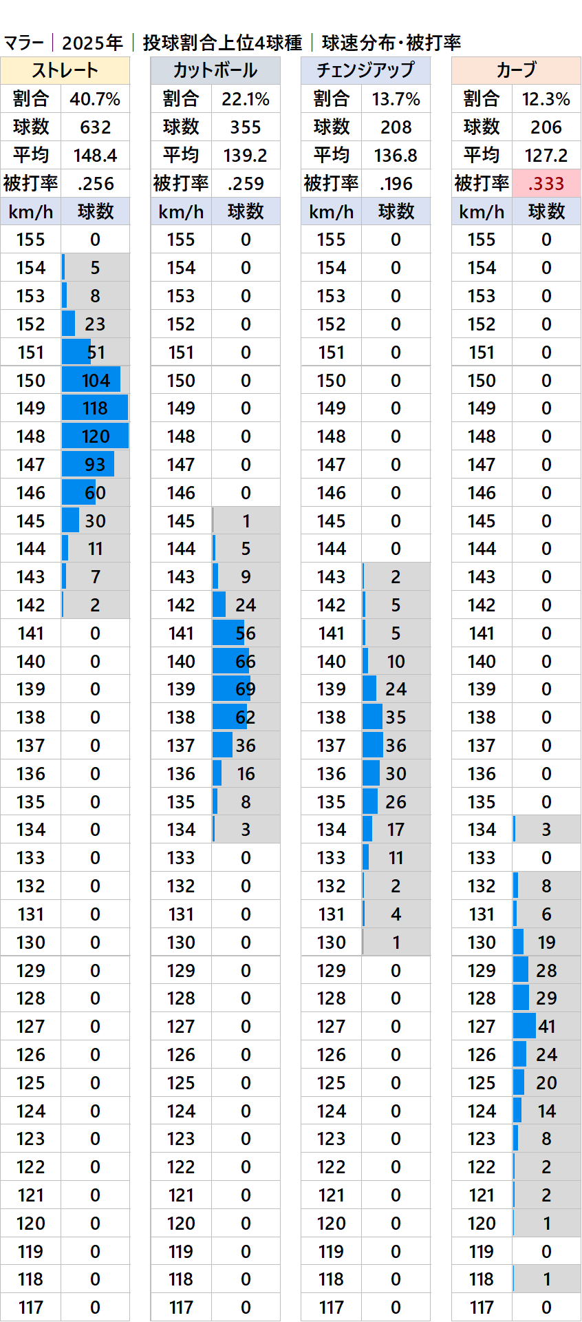 中日のマラー投手の2025年シーズンの球速・球種・被打率の情報です。