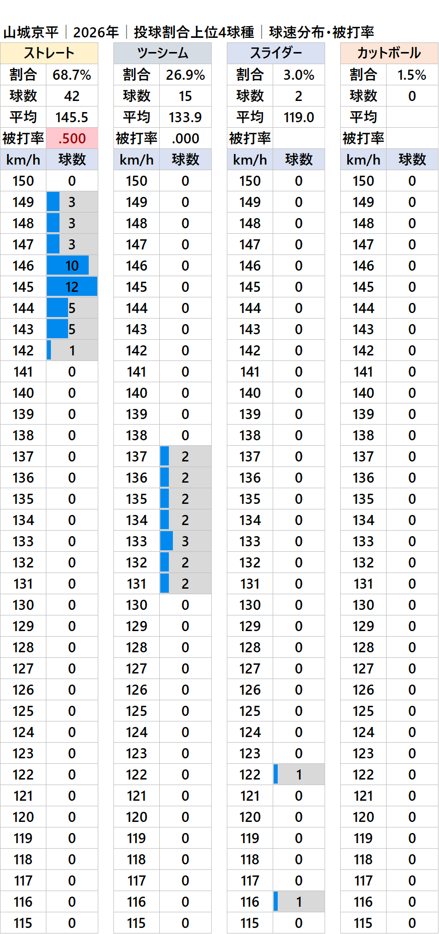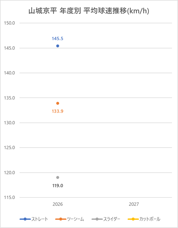 巨人の山城京平投手(左投)の2026年シーズンの球種別の投球割合・球速・被打率の情報です。