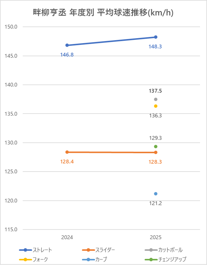 ストレートの平均球速は2024年と比較し1.5km/h上昇。