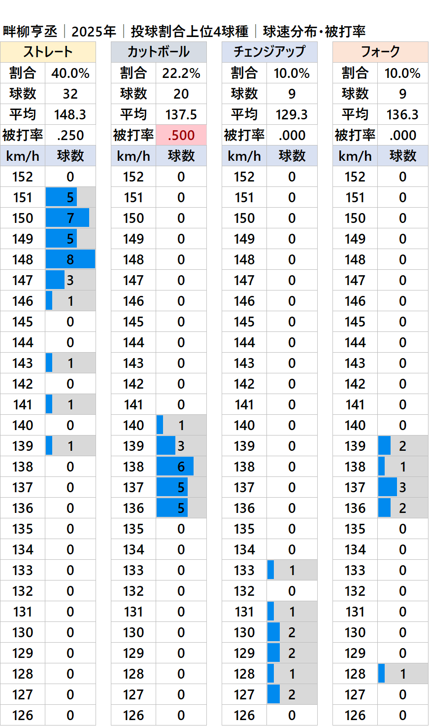球種別球速・投球割合・被打率