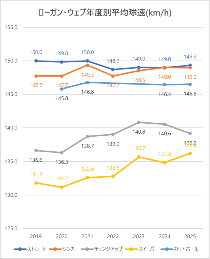シンカー(2シーム)の平均球速は2024年と比較し横ばい。