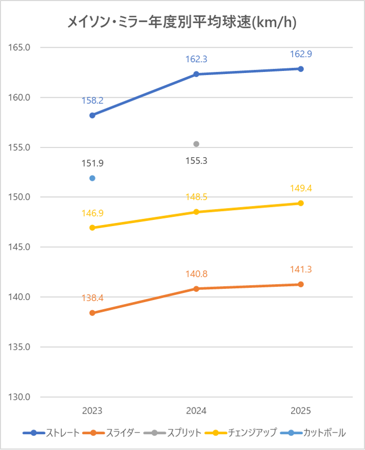 ストレート(4シーム)の平均球速は0.6km/h上昇。