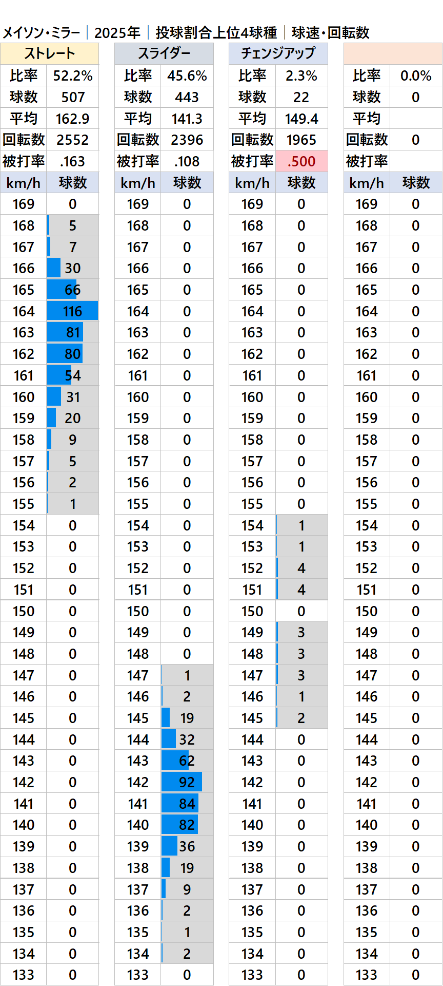 パドレスのメイソン・ミラー投手の2025年シーズンの球種別の投球割合・球速・回転数・被打率の情報です。