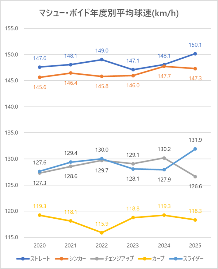 2024年と比較し、4シームの平均球速は2km/h上昇。