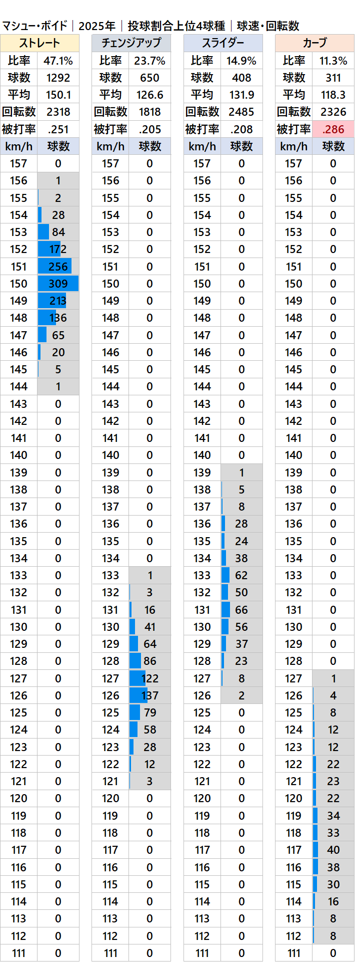 球種別球速・投球比率・被打率・回転数
