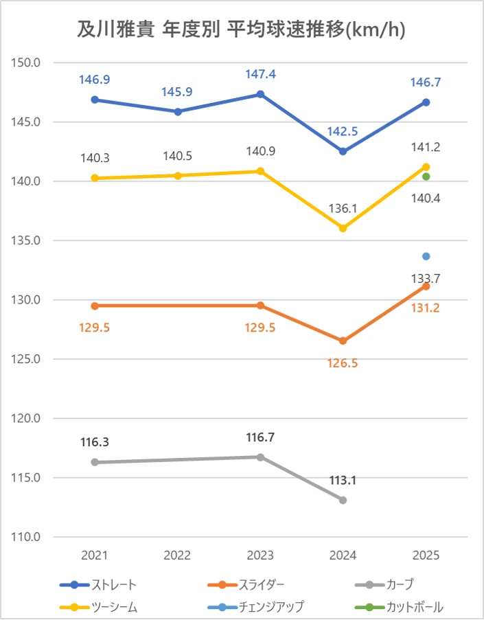 ストレートの平均球速は2024年と比較し4.3km/h上昇。