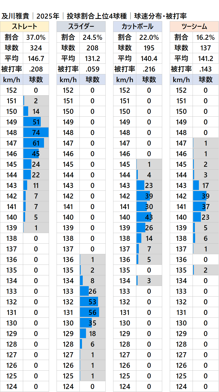 阪神の左腕、及川雅貴投手の2025年シーズンの球種別の投球割合・球速・被打率の情報です。