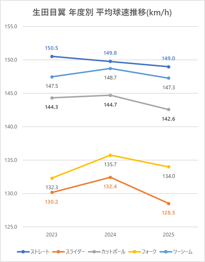 ツーシームの平均球速は2024年と比較し1.4km/h低下。