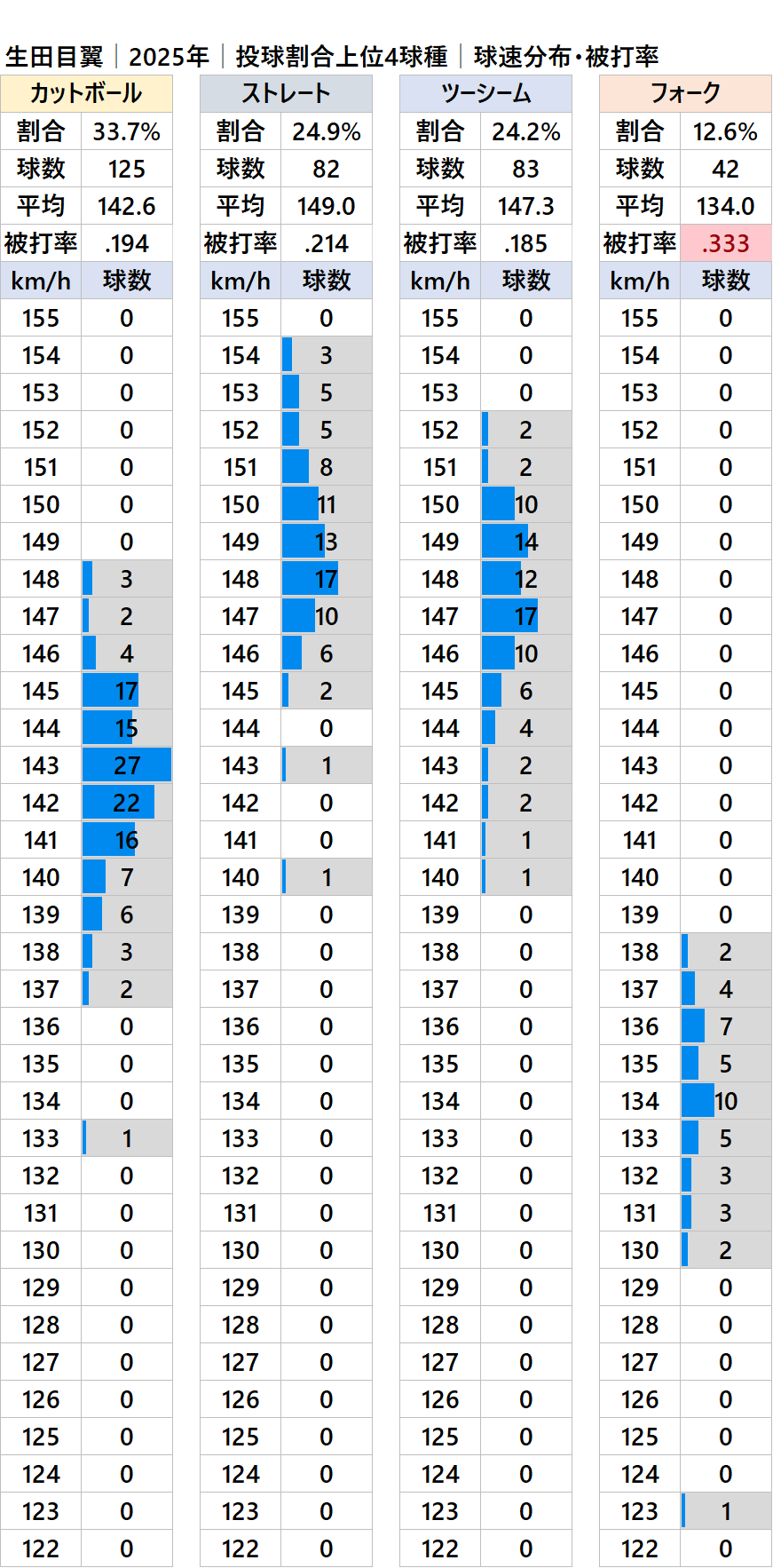 日本ハムの生田目翼投手の2025年シーズンの球種別の投球割合・球速・被打率の情報です
