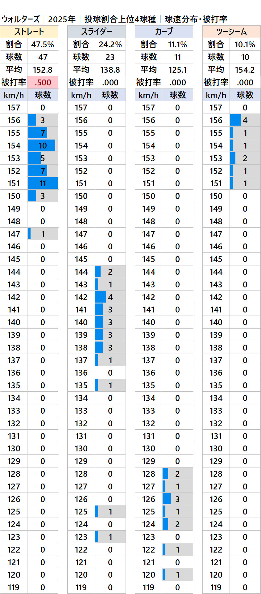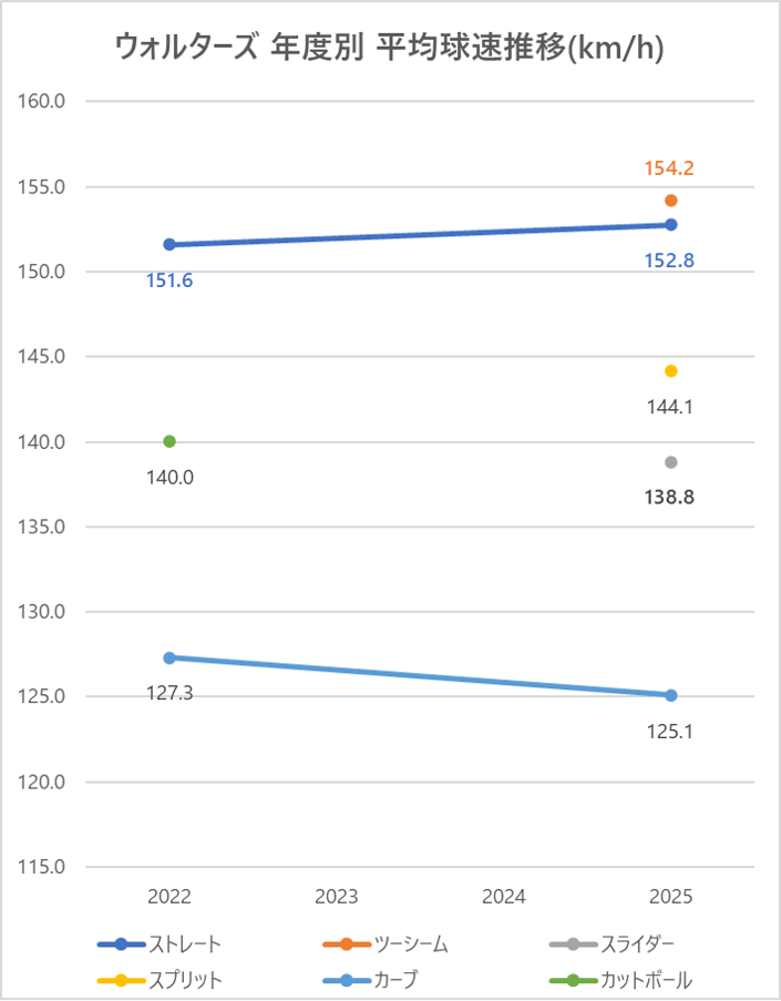 中日のウォルターズ投手(右投)の2025年シーズンの球速・球種・被打率の情報です。