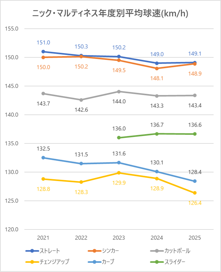 ストレート(4シーム)の平均球速は2024年と比較し横ばい。