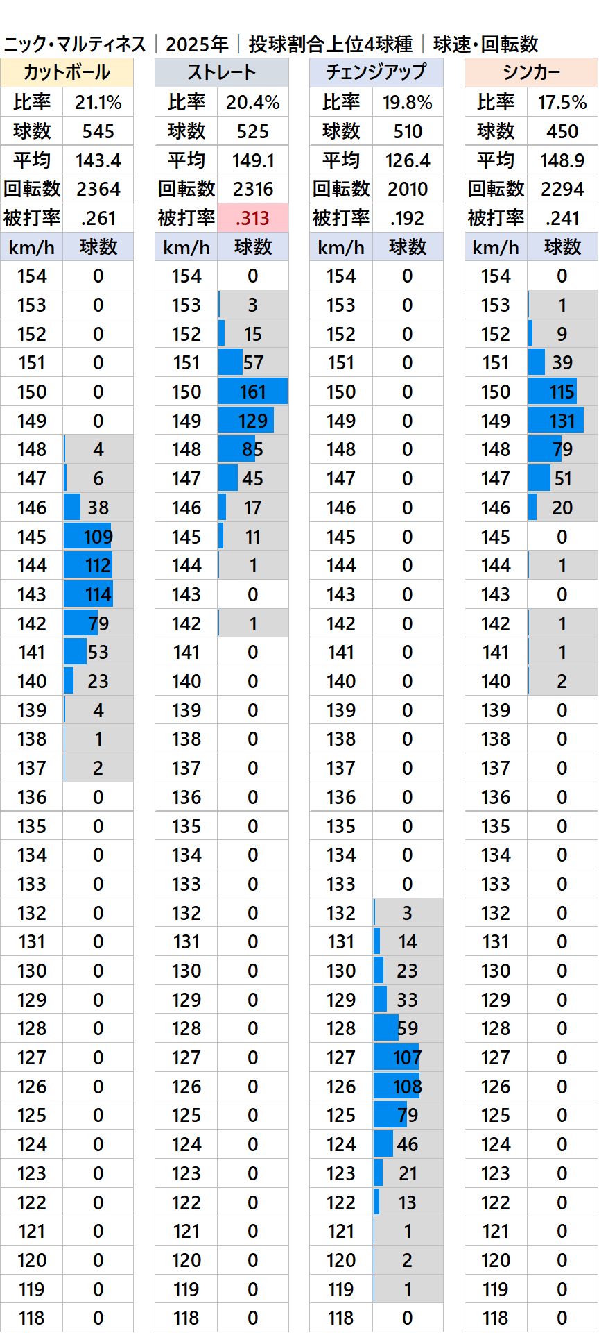 レッズのニック・マルティネス投手(右投/米国)の2025年シーズンの球速・球種・被打率・回転数の情報です。