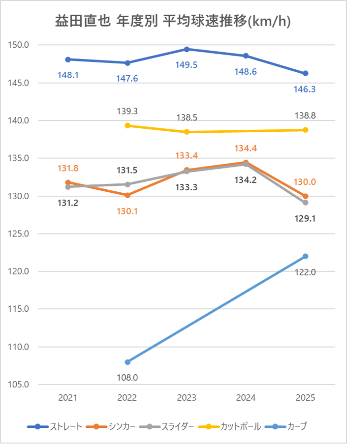 2024年と比較しストレートの平均球速は2.3km/h低下。