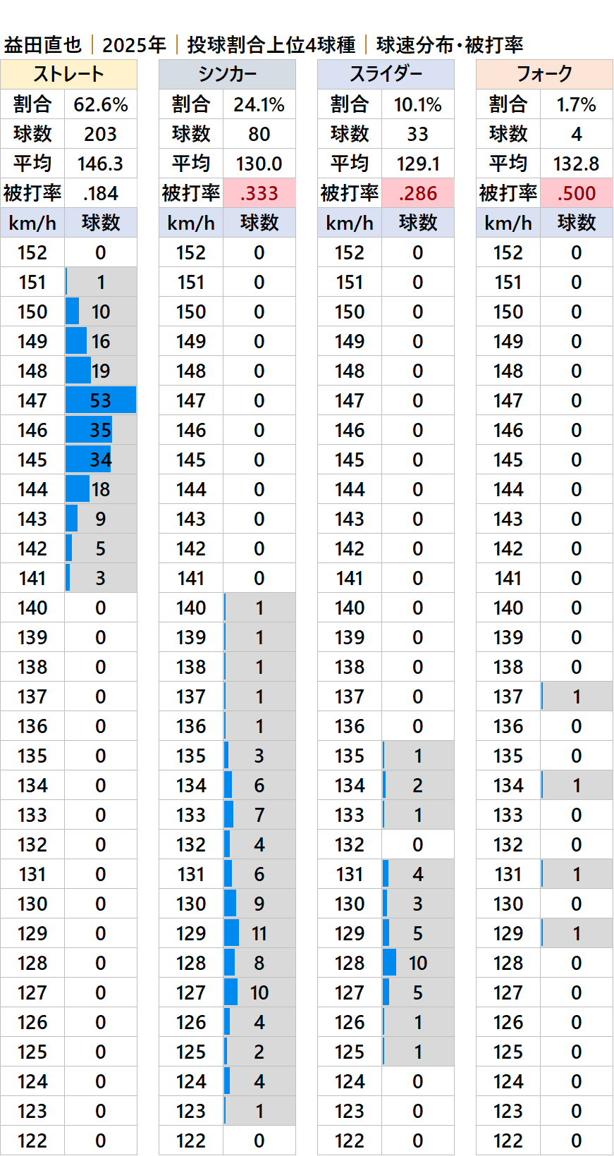 ロッテの益田直也投手(右投)の2025年シーズンの球種別の投球割合・球速・被打率の情報です。