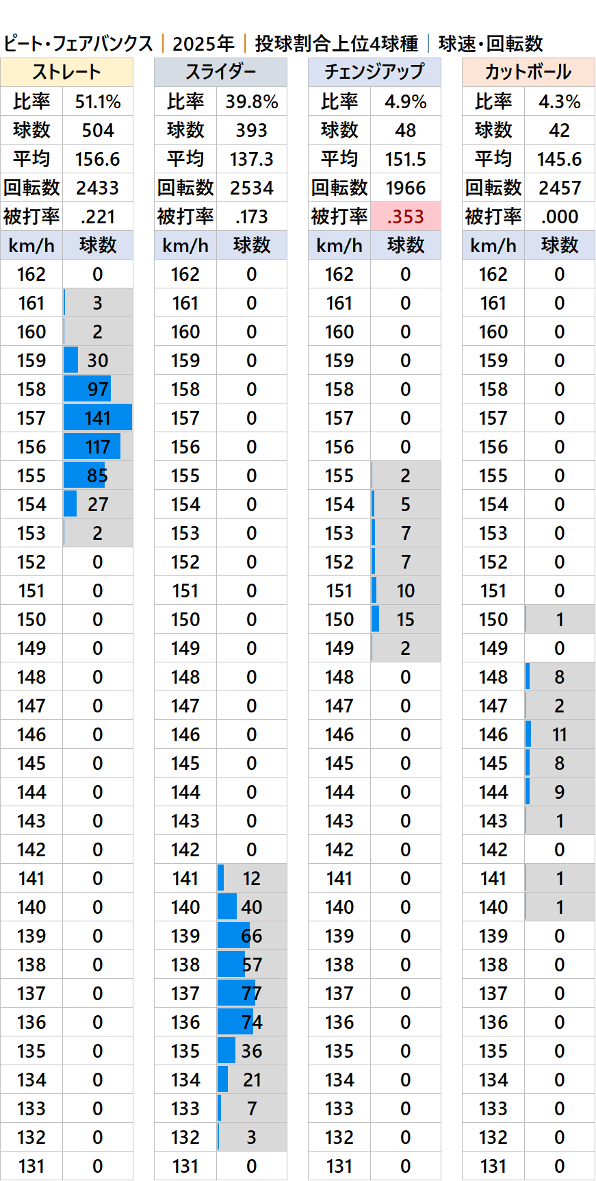 レイズのピート・フェアバンクス投手の2025年シーズンの球種別の投球割合・球速・回転数・被打率の情報です。