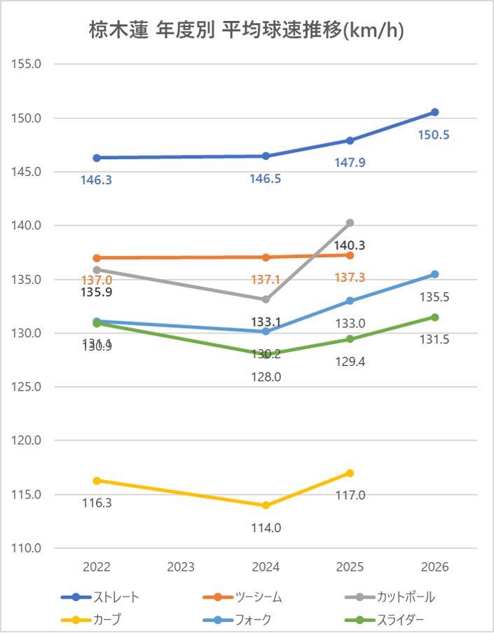 2025年と比較しストレートの平均球速は2.6km/h上昇。
