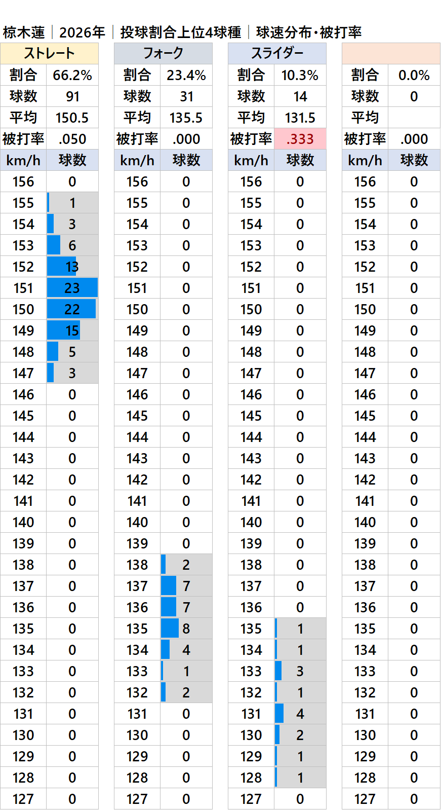 オリックスの椋木蓮投手(右投)の2026年シーズンの球種別の投球割合・球速・被打率の情報です。