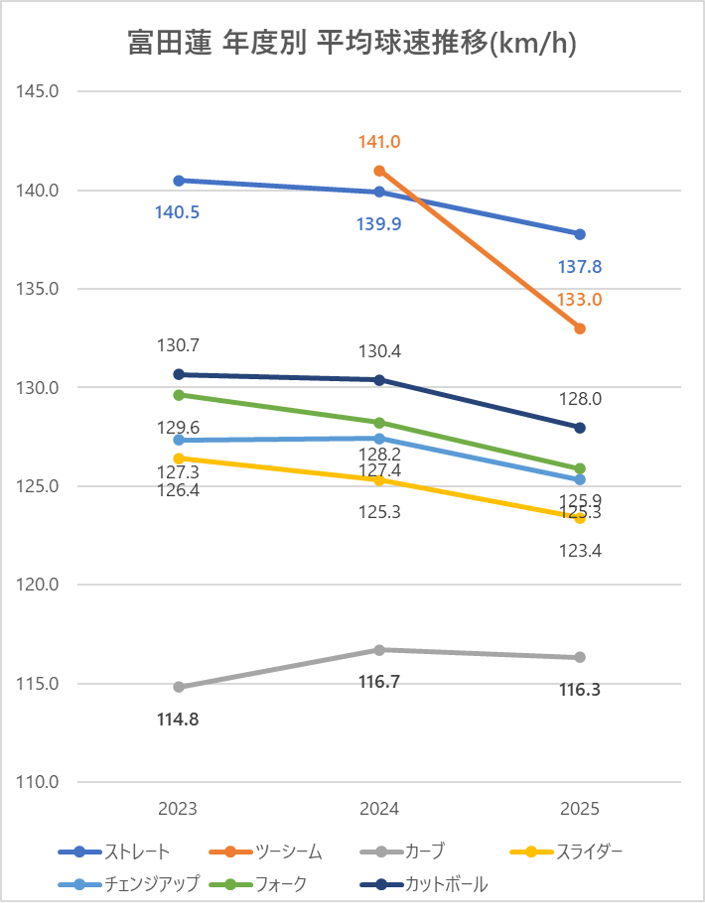 リリーフだった2024年と比較しストレートの平均球速は2.1km/h低下。