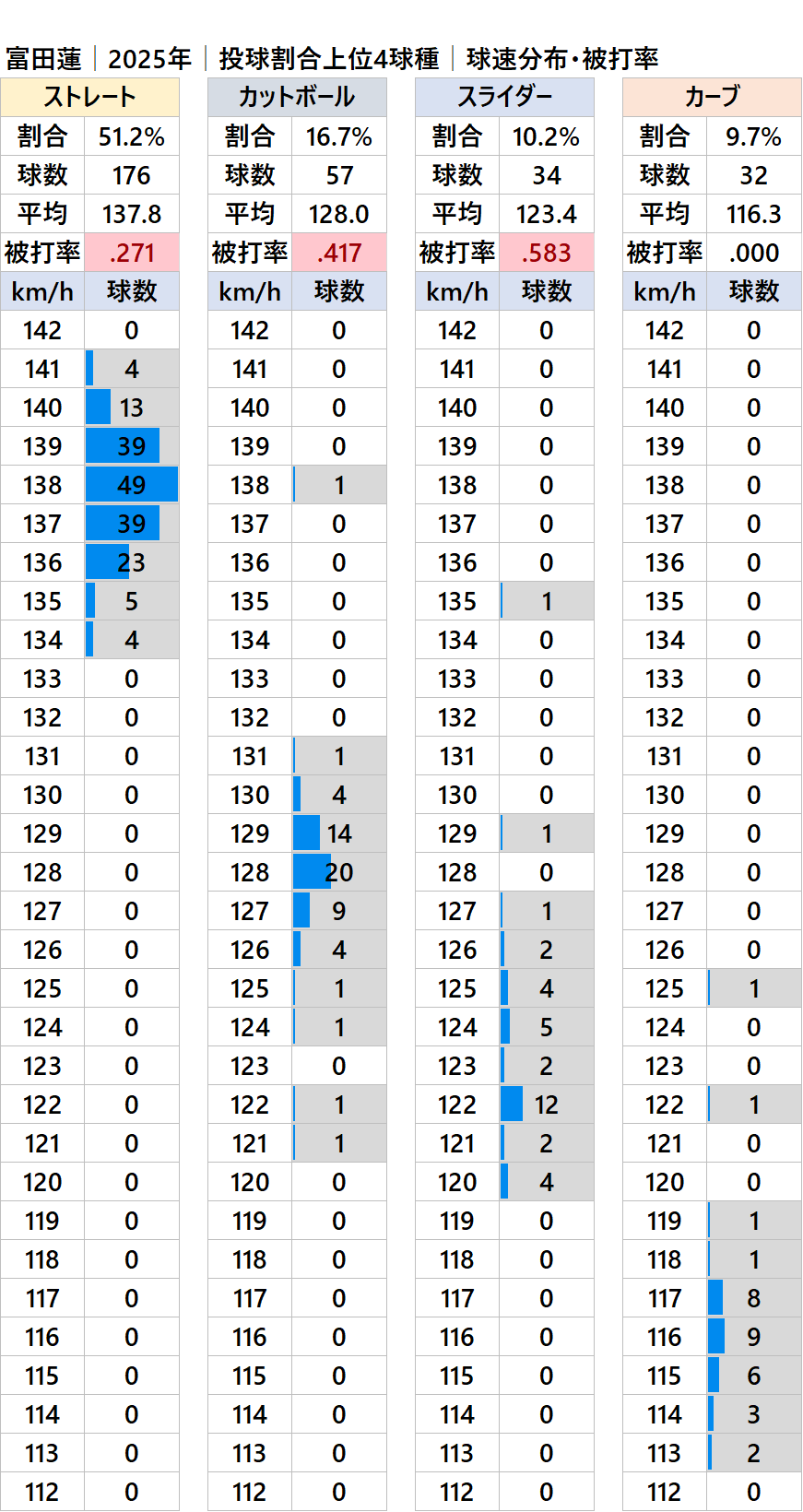 阪神の富田蓮投手の2025年シーズンの球種別の投球割合・球速・被打率の情報です。