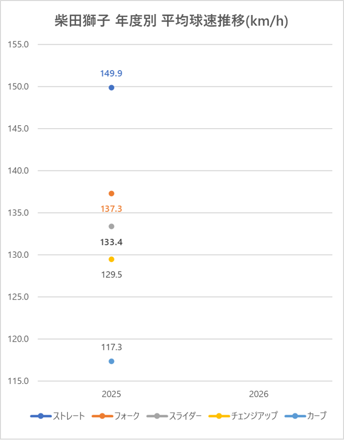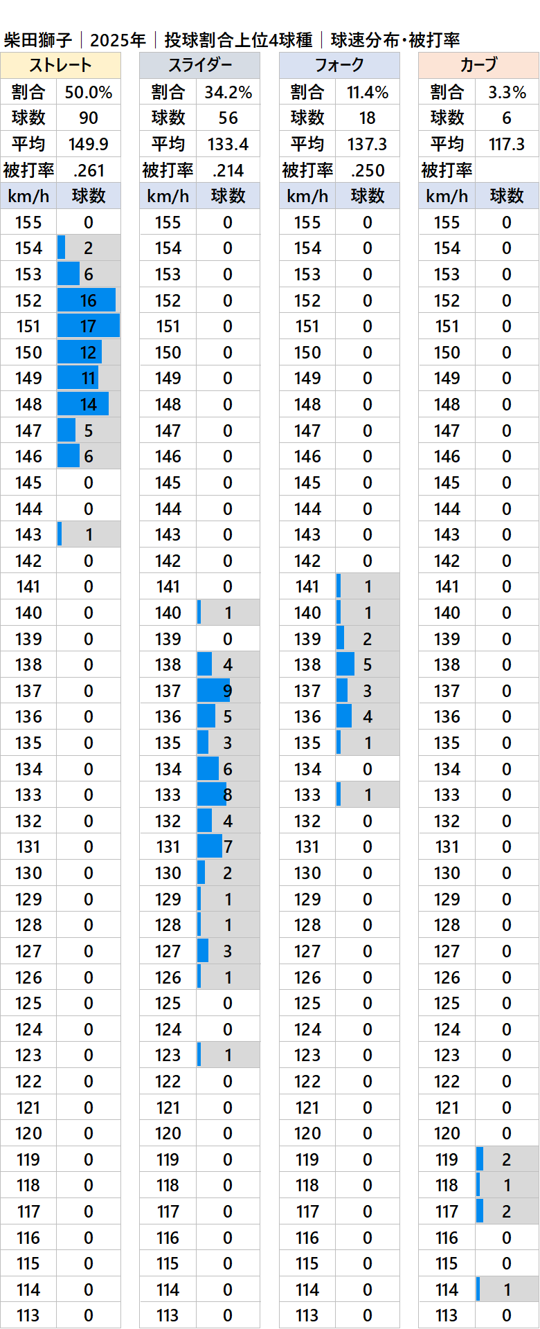 日本ハムの柴田獅子投手の2025年シーズンの球種別の投球割合・球速・被打率の情報です。