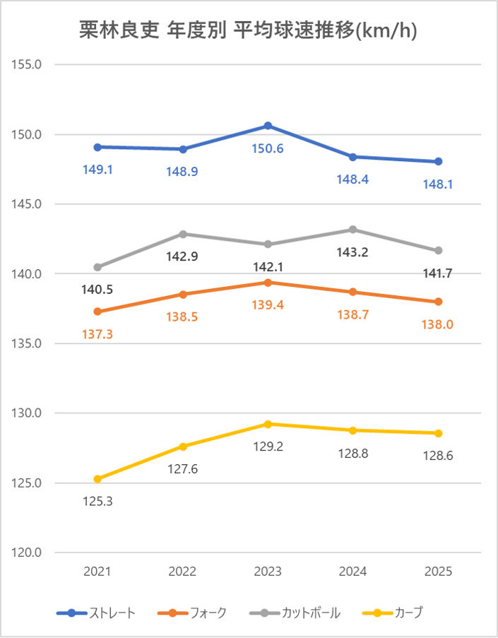 ストレートの平均球速は2024年と比較して横ばい。
