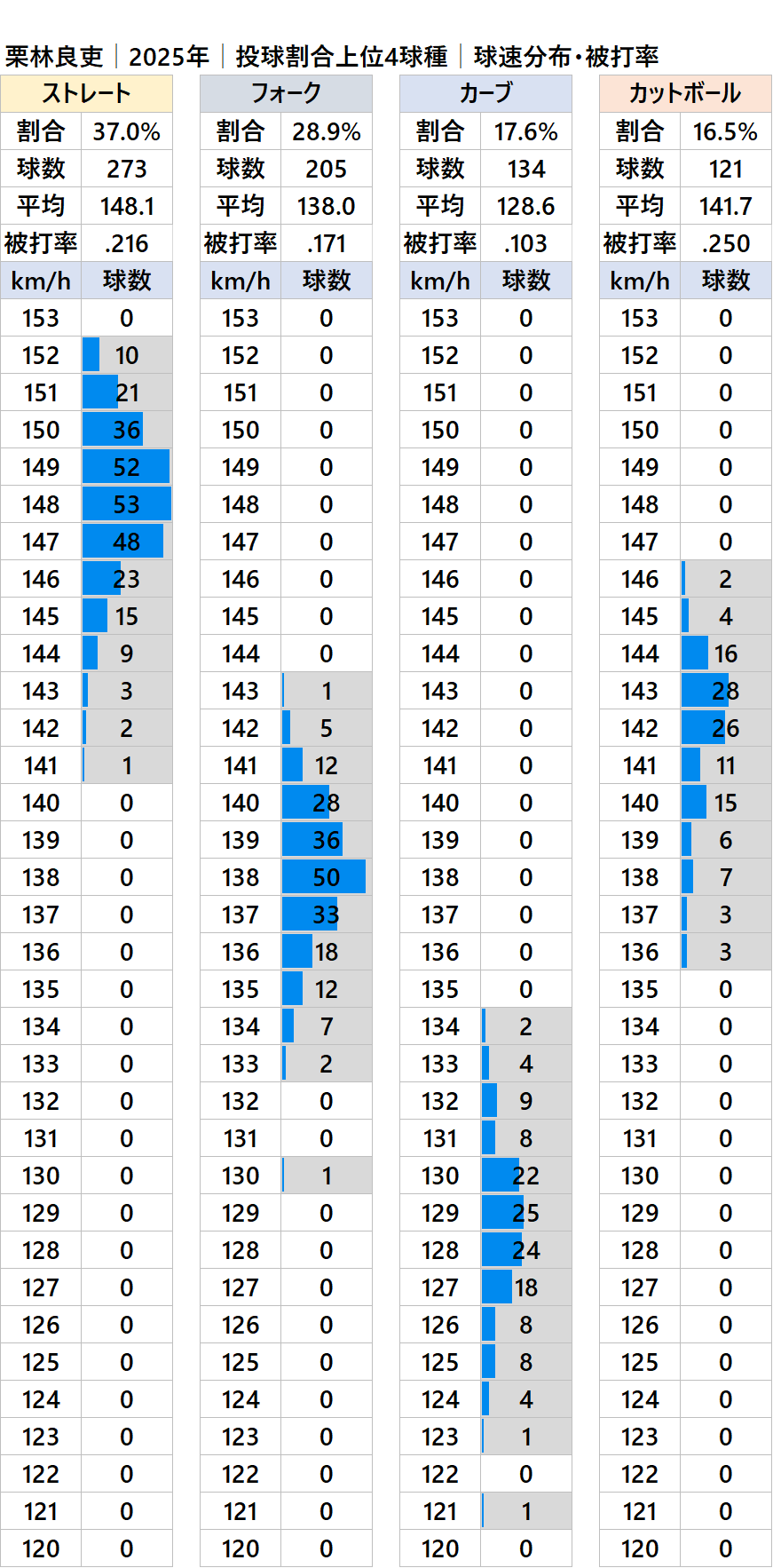 広島の栗林良吏投手の2025年シーズンの球種別の投球割合・球速・被打率の情報です。