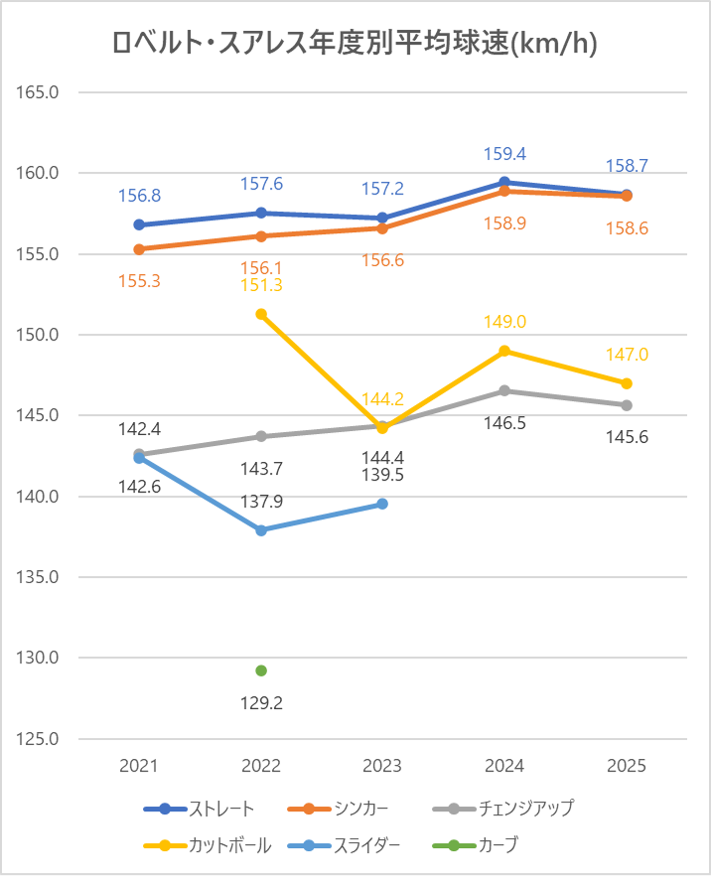 2024年と比較しストレート(4シーム)の平均球速は0.7km/h低下。