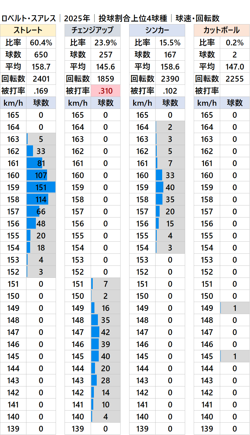 球種別球速・投球割合・回転数・被打率