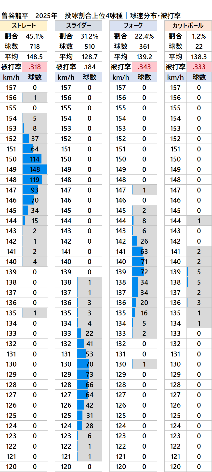 球種別球速・投球割合・被打率