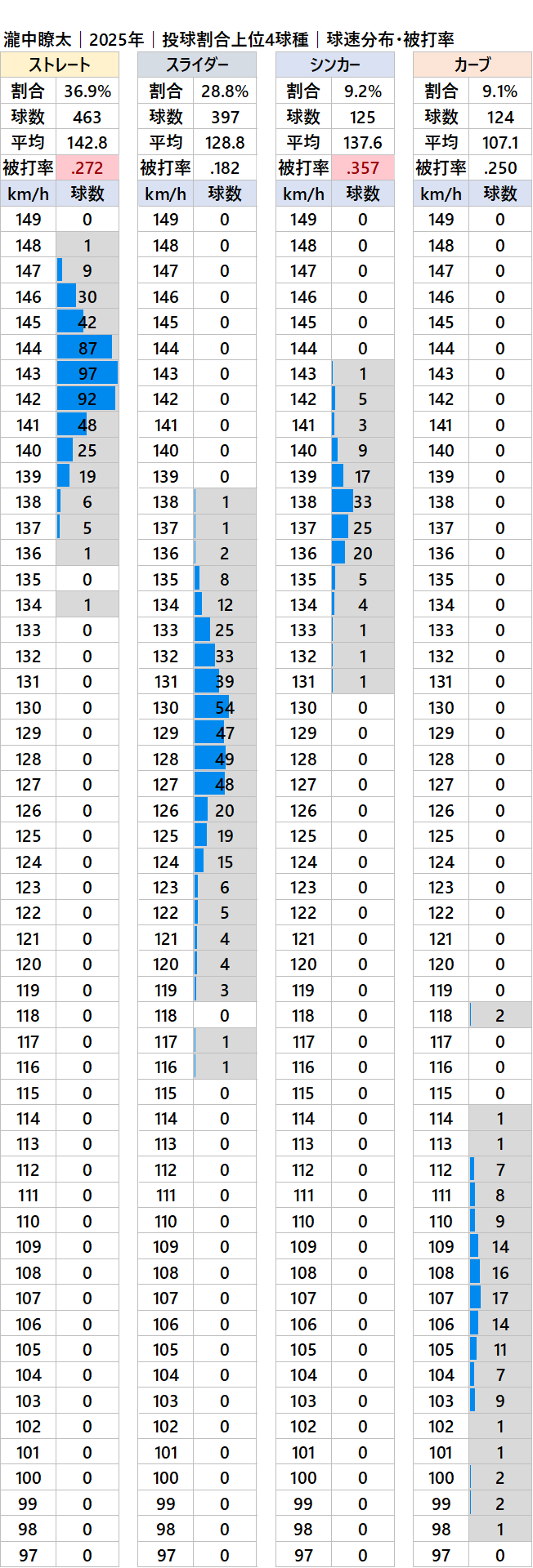 楽天の瀧中瞭太投手(右投)の2025年シーズンの球種別の投球割合・球速・被打率の情報です。